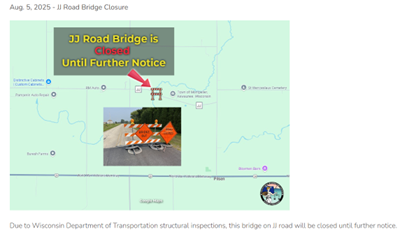 The two structures rated severe—located on Sleepy Hollow Road (just south of STH 29) and JJ Road—have been closed to traffic. These closures significantly affect local milk haulers, forage producers, manure-hauling farm operations, and residents. As a result, detours are increasing wear and tear on other town roads and disrupting agricultural logistics in this heavily farming-dependent community.