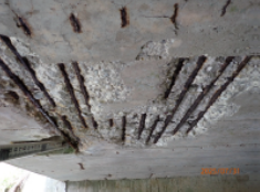 Spalling and exposed rebar.